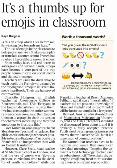 • Quoted in Burgess, K. (2018) "It's a thumbs up for emojis in classroom". The Times, 19 May. (image)